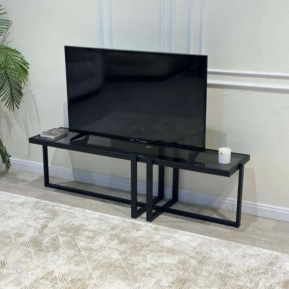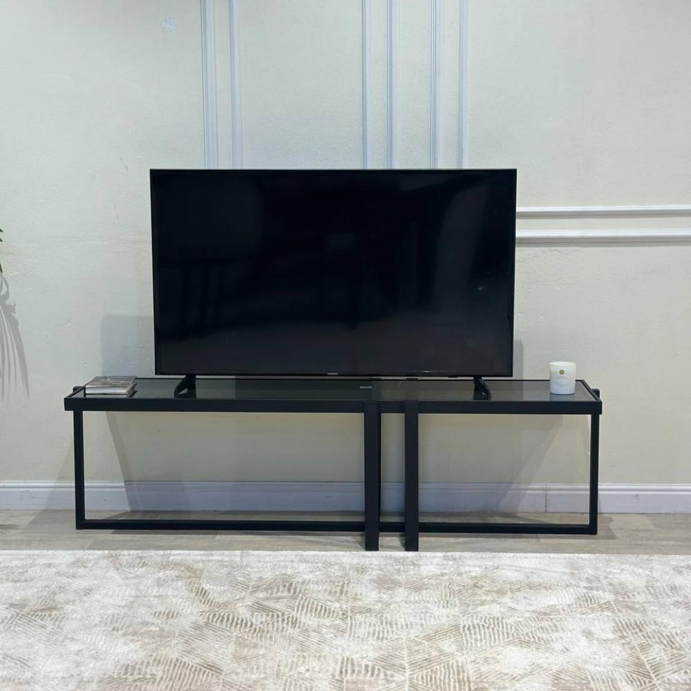 طاولة تلفزيون بتصميم عصري أنيق، مصنوعة من هيكل حديد أسود مطفي أو لامع مع أسطح من الزجاج الأسود الشفاف، ما يمنحها مظهرًا أنيقًا وعصريًا يتماشى مع الديكورات الحديثة والصناعية.