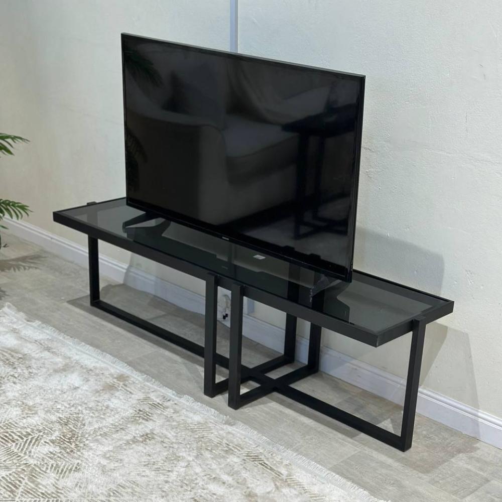 طاولة تلفزيون حديد أسود زجاج أسود شفاف